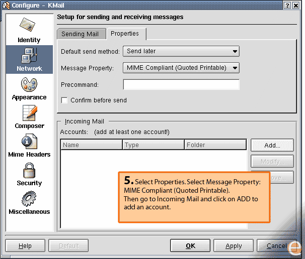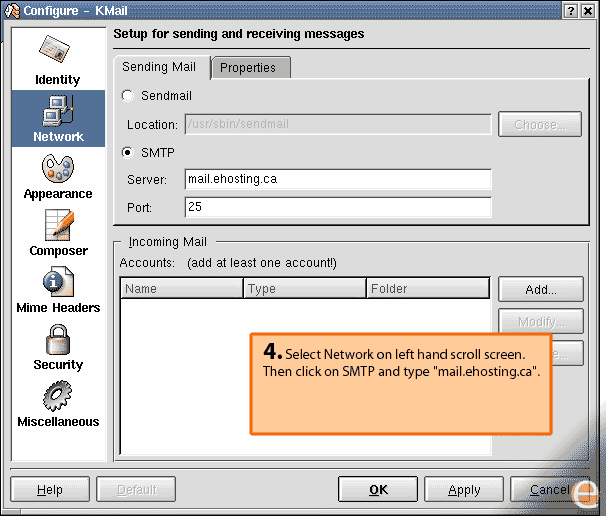 4. Under SMTP, please type in either mail.ehosting.ca OR mail1.ehosting.ca OR mail2.ehosting.ca depending on your account settings.
