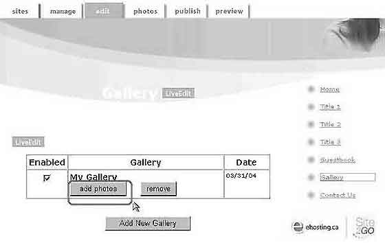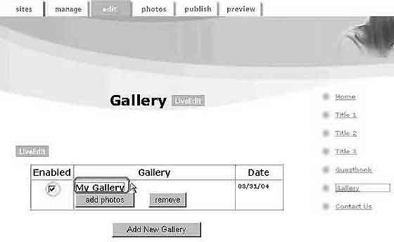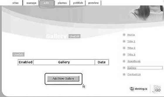 L\гyӤï/~ؿ1. AQʪ䪺s 2. Цb"manage" menu ̿ "Gallery" 3. bedit menuM"Add New Gallery" 4. JDӤï/~ؿM"apply"Tw 5. nbӤï/~ؿW[ӤЫ"add photos" 6. ܧAn[JӤ"use this image" 7. nЫAӤï~ؿD 8. 鷺eЫ"LiveEdit"Cn[t@ӷӤï"Gallery" |